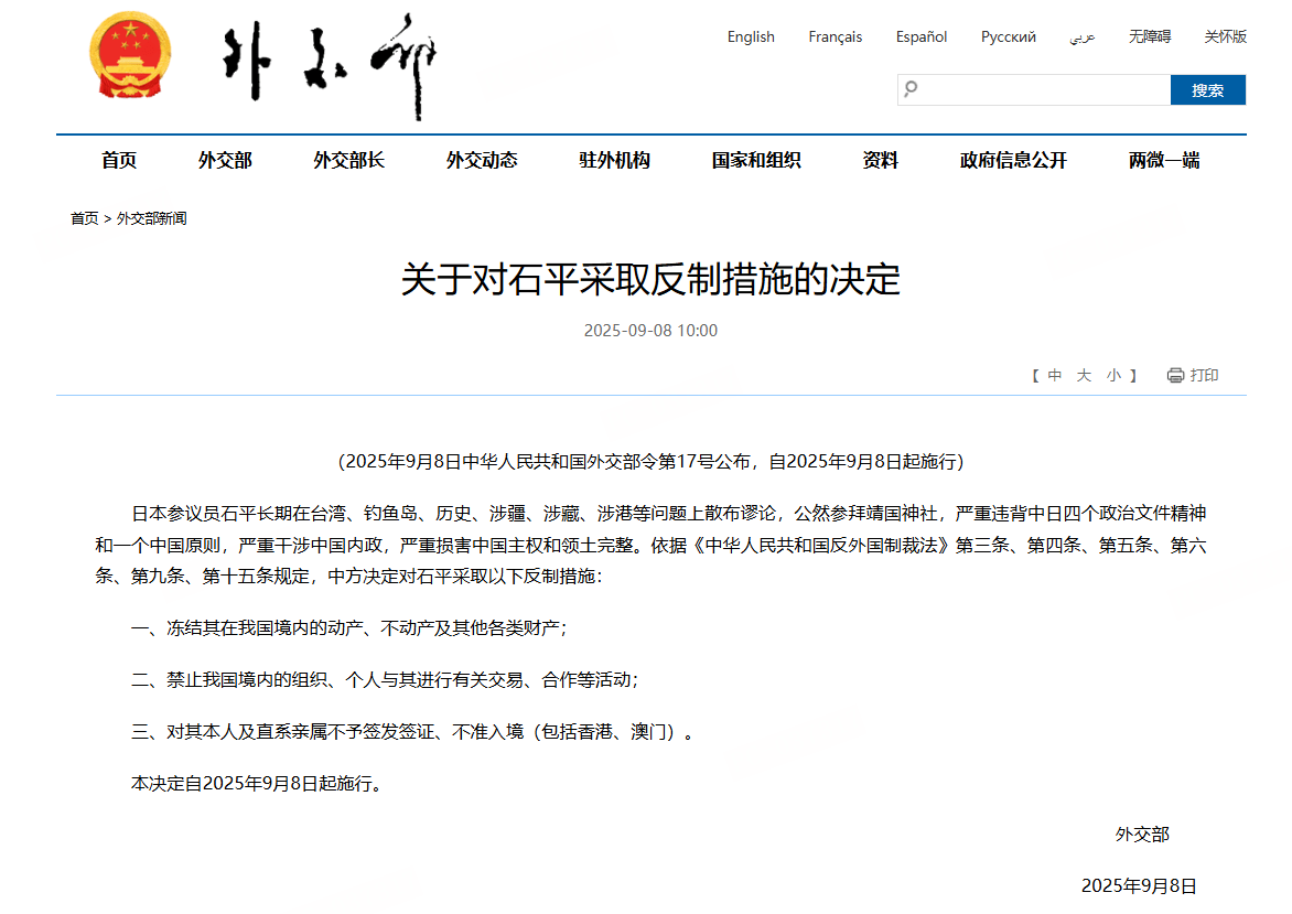 9月8日,中国外交部发布了关于对日本参议员石平采取反制措施的决定,自2025年9月8日起施行。具体包括: